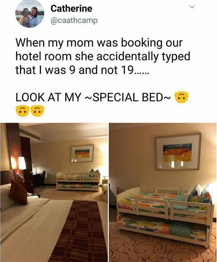 It’s good to be prepared for the unexpected when traveling and appreciate the opportunity to make unforgettable memories. However, we are not sure this person will do any of that after their mother wrote they were 9 years old instead of 19, and they ended up getting a mini bed.
