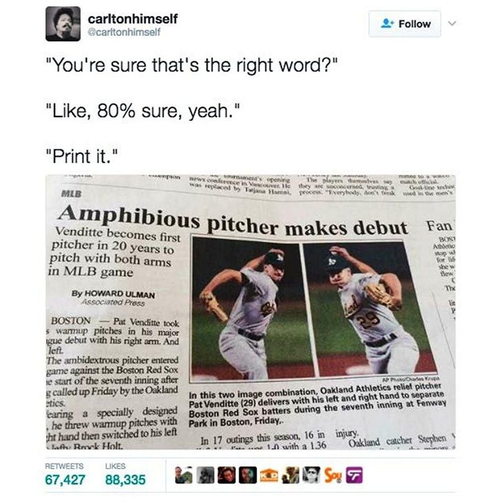 Journalists face intense pressure to meet deadlines in the fast-paced and time-sensitive news industry. This can sometimes end in disastrous errors, as they often have no time to edit, as illustrated by a mistake in the 2015 East Oregonian. The post featured a photo and an incorrect title referring to former MLB pitcher Pat Venditte.